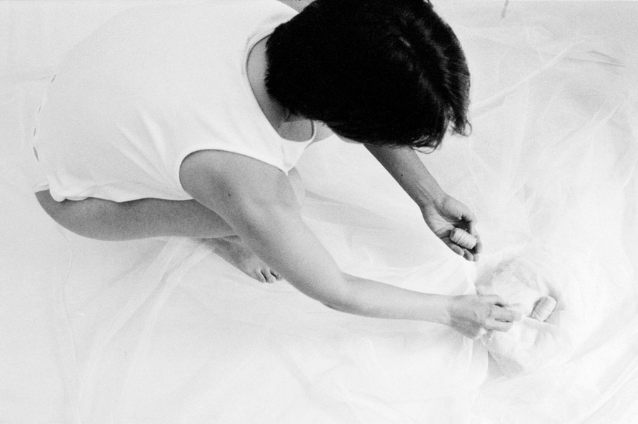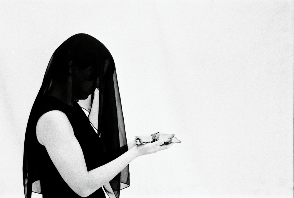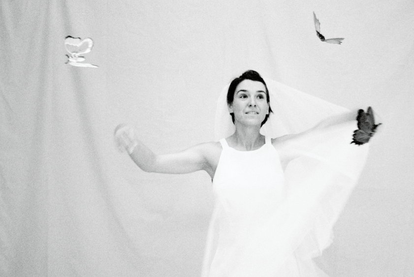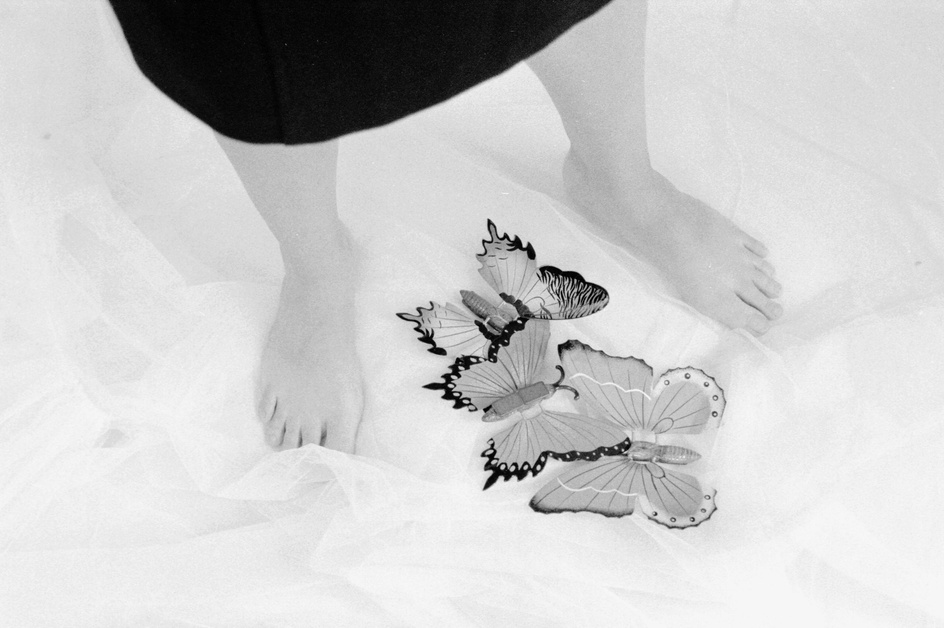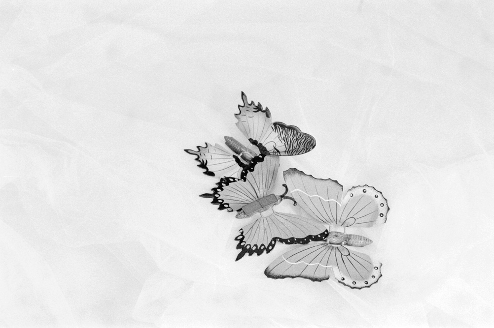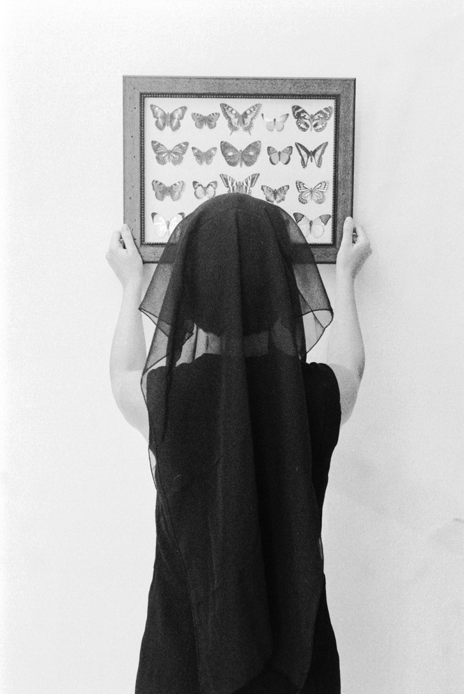 In a ritual with a magical, dreamlike, and minimalist atmosphere, I act and photograph my own performance. I utilize the life cycle of the butterfly and the archetypes of the creator, the bride, and the widow to represent the identity‘ metamorphoses through which women navigate.